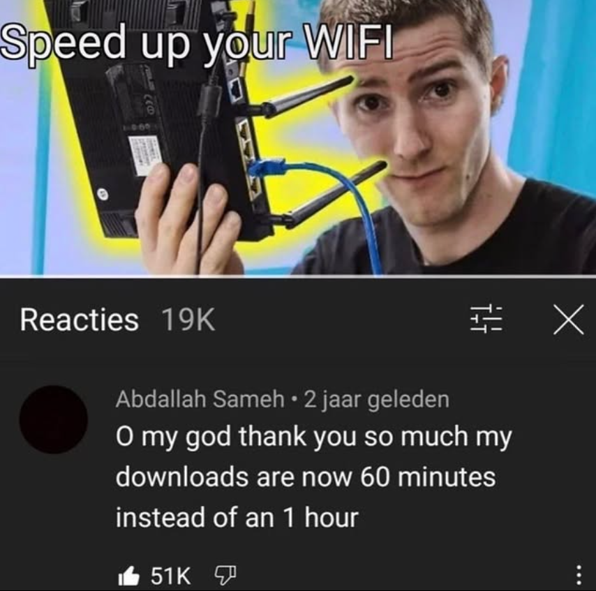 audino1077@lemmy.wtf · 10 hours agospeeding up WiFi 😂lemmy.wtfimagemessage-square2linkfedilinkarrow-up195arrow-down13