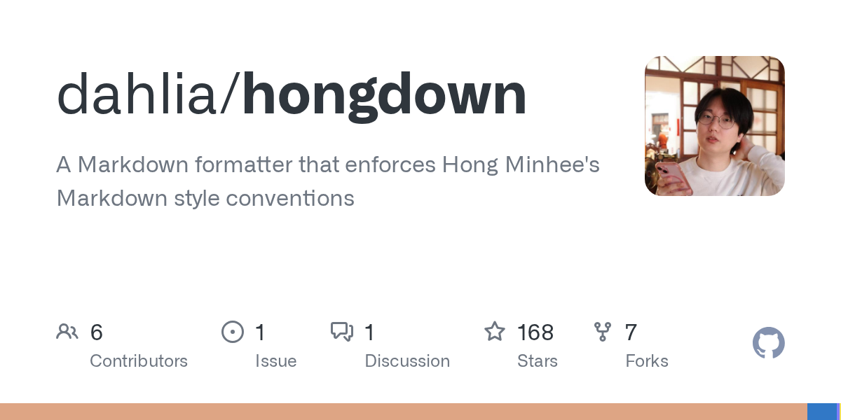 洪 民憙 (Hong Minhee)@lemmy.mlEnglish · 1 month agoHongdown: An opinionated Markdown formatter in Rustplus-squaregithub.comexternal-linkmessage-square0linkfedilinkarrow-up15arrow-down10
