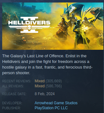 pro_grammer@programming.dev to Steam@lemmy.ml · 2 years agoHelldivers 2 reviews start to improve after Sony backs down from enforcing PSN account linkingprogramming.devimagemessage-square62linkfedilinkarrow-up1358arrow-down115