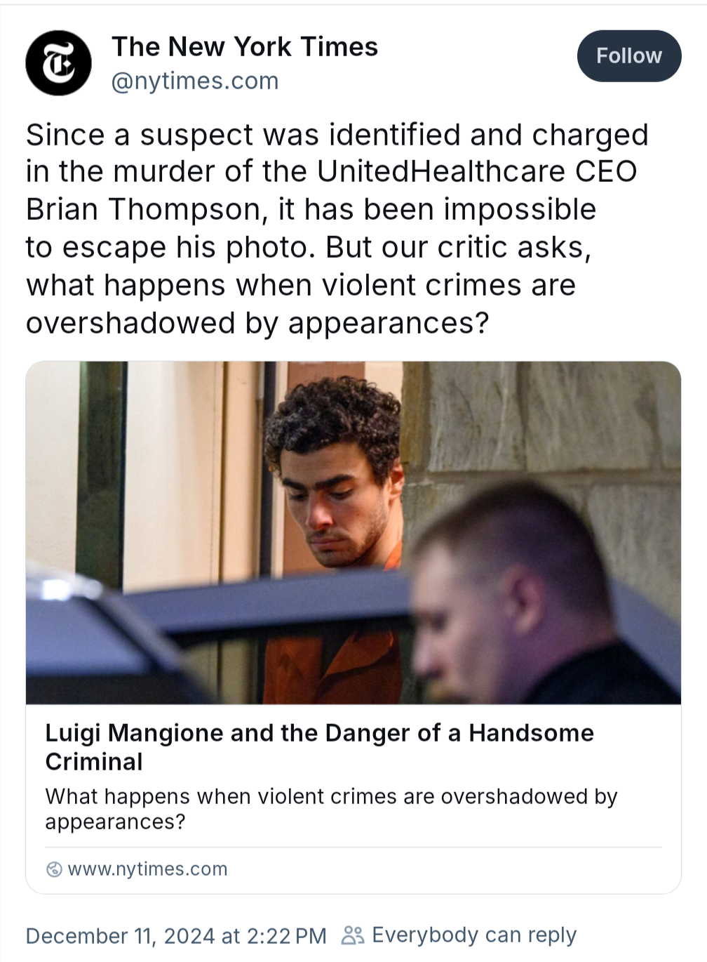 BonesOfTheMoon@lemmy.world to Antiwork@lemmy.ml · 1 year agoIs the New York Times fuckin' serious right now. (AKA another attempt to undermine Luigi's support).lemmy.worldimagemessage-square106linkfedilinkarrow-up1496arrow-down128