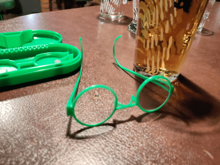 I printed this pair of glasses with a roll of ugly bright green PLA I use to print prototypes or silly things with - because, well, it’s ugly - at the last minute to go to a party where the idea is to not look too serious.