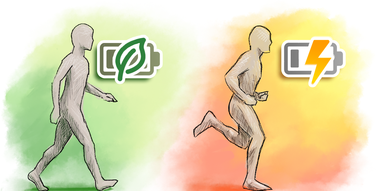 I agree that the exhaustion is different: different muscles are being used and they’re being used differently. Maybe saying that was factually wrong. My bad. I was trying to get across the point that energy expenditure past the switch-to-running point is higher if you choose to keep walking than if you run. But the fact that there’s more energy expenditure doesn’t necessarily mean that you’ll be more exhausted; it could be that when you run, even though you can save energy, it actually uses muscles that are not properly trained and therefore get fatigued faster than the muscles you’d use if you walked.