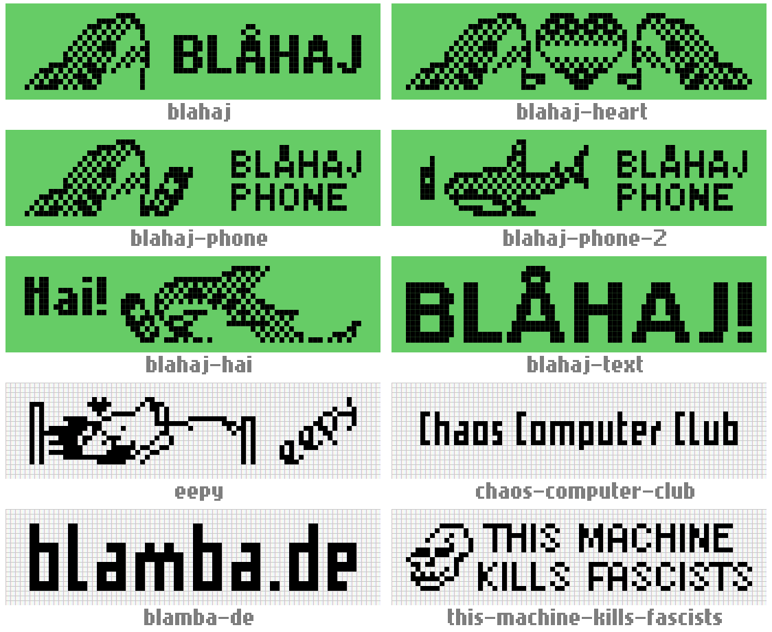 These were made soon after I learnt about Blåmba, a Blåhaj-themed provider of content for retro phones running on GSM networks at Chaos Computer Club’s events since 2023. There was a dire lack of Blåhaj among these 72x14 1bpp pictures (“operator logos”) you can use on the home screen instead of the name of your phone carrier.