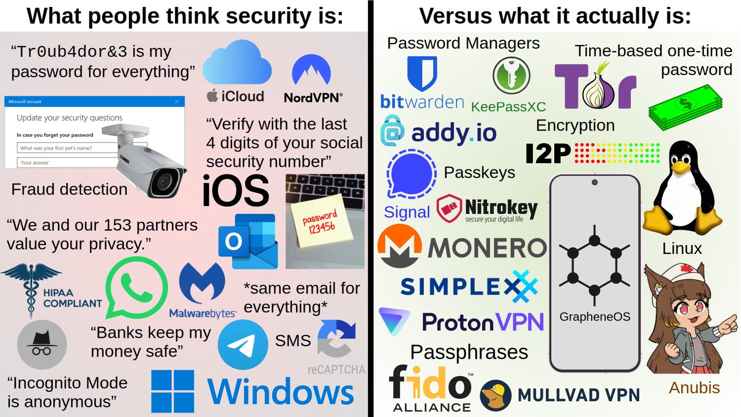 I’ll go further than this and say that true security is where everybody has support enough to not want to steal your shit, hack you etc.
