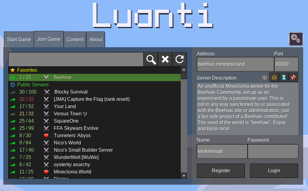 To play, download the Luanti client for your desktop or mobile platform. The server should be visible in the server list under the name “Beehive”. Just pick a name and password and start building fun stuff!