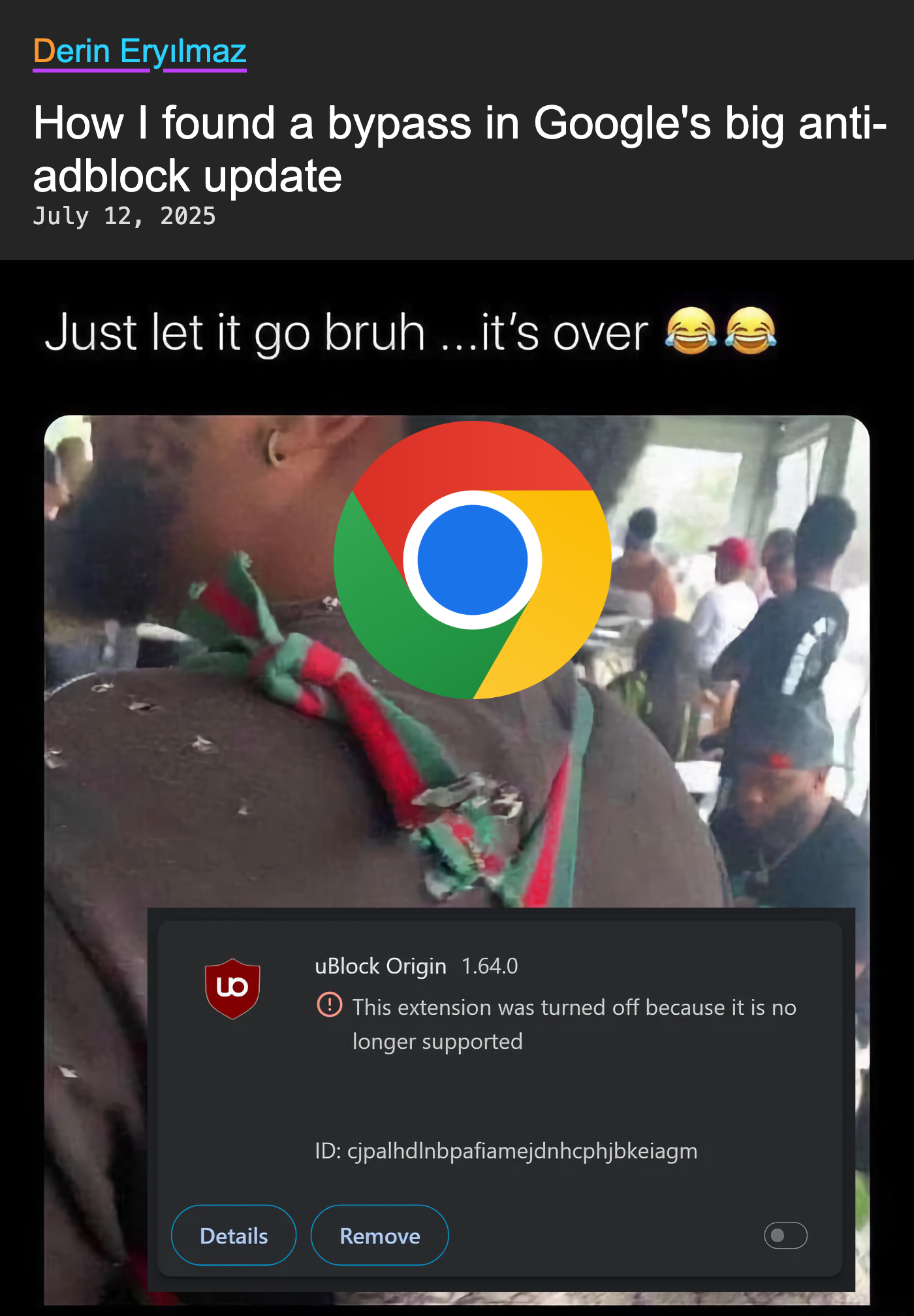 minus-squareCapricorn_Geriatric@lemmy.worldlinkfedilinkarrow-up16arrow-down1·7 months agoToday “This extension is no longer supported” doesn’t mean there’s something seriously wrong with it, it means “Google doesn’t support the fact you want to use it”.