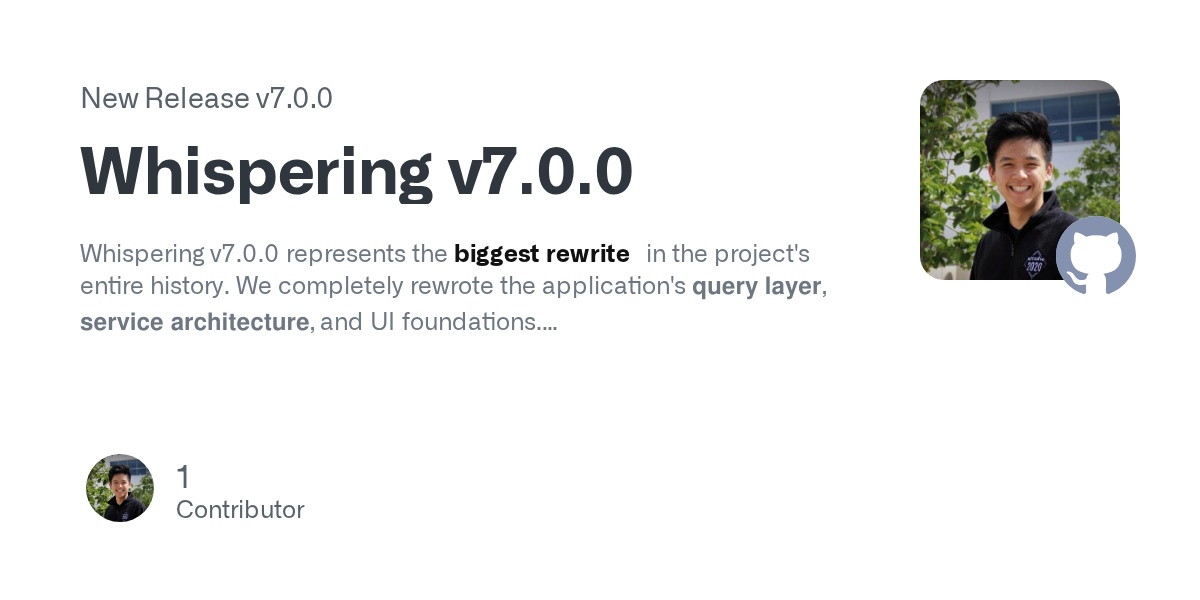 Whispering v7.0.0 represents the biggest rewrite in the project’s entire history. We completely rewrote the application’s query layer, service architecture, and UI foundations.