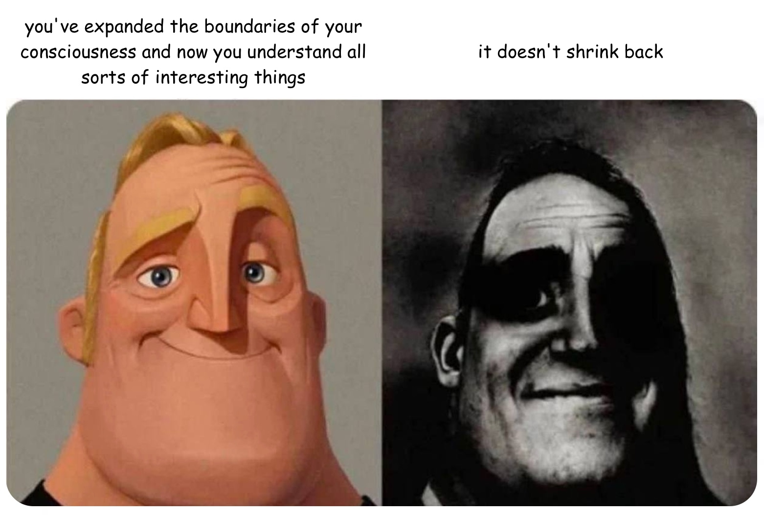 minus-squareNarri N.@lemmygrad.mllinkfedilinkarrow-up7·5 months agooh yeah, i loved it when i got somewhat better from my own internal haze (depression and bpd and anxiety and shit) only to realize the world’s actually gone to shit, and now i can clearly see what and why and how.