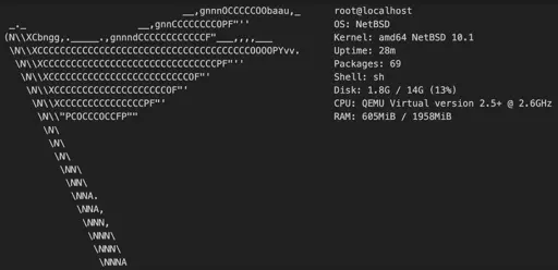 __,gnnnOCCCCCOObaau,_ root@localhost _._ __,gnnCCCCCCCCOPF"'' OS: NetBSD (N\\XCbngg,._____.,gnnndCCCCCCCCCCCCF"___,,,,___ Kernel: amd64 NetBSD 10.1 \N\\XCCCCCCCCCCCCCCCCCCCCCCCCCCCCCCCCCCCCCCOOOOPYvv. Uptime: 34m \N\\XCCCCCCCCCCCCCCCCCCCCCCCCCCCCCCCPF"'' Packages: 69 \N\\XCCCCCCCCCCCCCCCCCCCCCCCCCOF"' Shell: sh \N\\XCCCCCCCCCCCCCCCCCCCCOF"' Disk: 1.8G / 14G (13%) \N\\XCCCCCCCCCCCCCCCPF"' CPU: QEMU Virtual version 2.5+ @ 2.6GHz \N\\"PCOCCCOCCFP"" RAM: 606MiB / 1958MiB \N\ \N\ \N\ \NN\ \NN\ \NNA. \NNA, \NNN, \NNN\ \NNN\ \NNNA