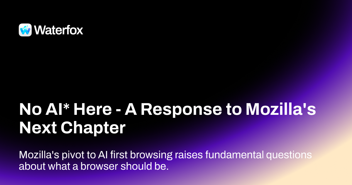 Some will argue that AI browsers are inevitable, that we’re fighting against the tide of history. Perhaps. AI browsers may eat the world. But the web, despite having core centralised properties, is fundamentally decentralised. There will always be alternatives. If AI browsers dominate and then falter, if users discover they want something simpler and more trustworthy, Waterfox will still be here, marching patiently along. We’ve been here before. When Firefox abandoned XUL extensions, Waterfox Classic preserved them. When Mozilla started adding telemetry and Pocket and sponsored content, Waterfox stripped it out. I like to think that where there is want for a browser that simply respects you, Waterfox has delivered.