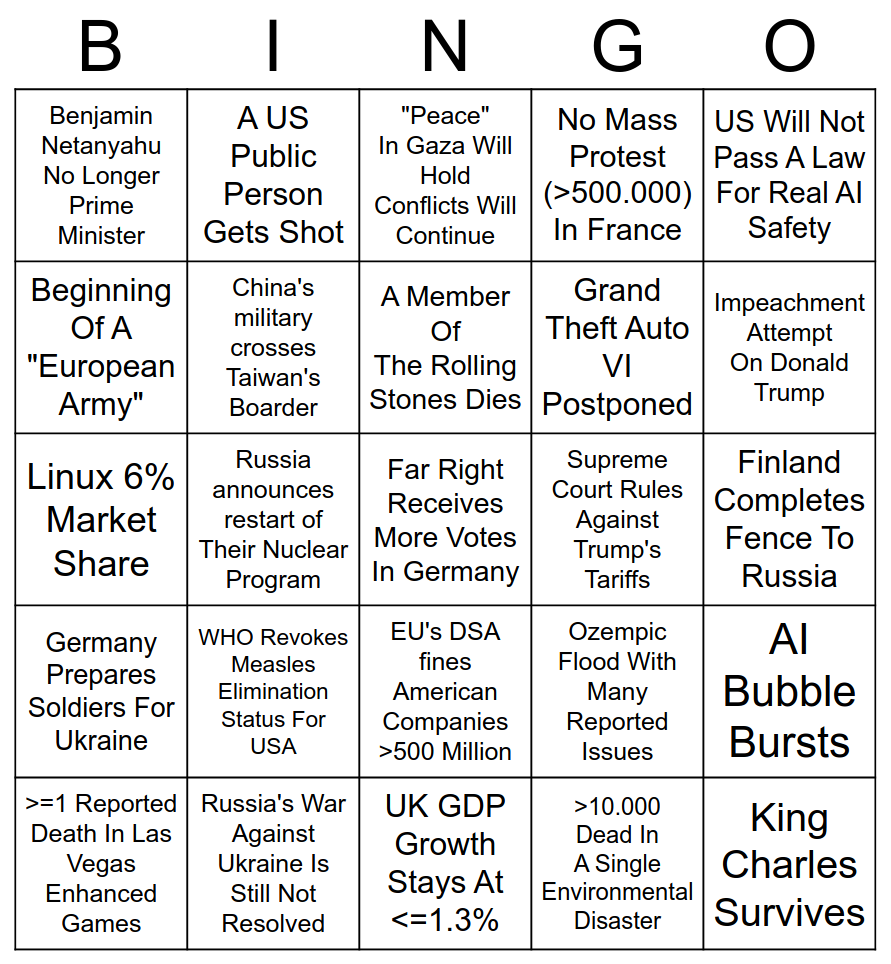 I recently saw someone creating a bingo chart for 2025 so I decided to create one for 2026 (image of this post). What are your predictions for 2026?