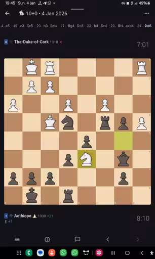 [Event “Rated Rapid game”] [Site “https://lichess.org/dFLFTPqF”] [Date “2026.01.04”] [White “The-Duke-of-Cork”] [Black “Aethiope”] [Result “0-1”] [WhiteElo “1318”] [BlackElo “1330”] [WhiteRatingDiff “-6”] [BlackRatingDiff “+21”] [Variant “Standard”] [TimeControl “600+0”] [ECO “A40”] [Opening “Queen’s Pawn Game”]