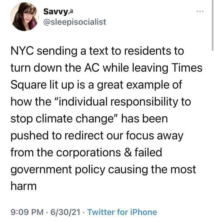 If the wealthiest intersection on the planet cant even pay lip service to an issue like that, how is anyone going to take the issue seriously? “You must reduce your comfort for the greater good, but the advertisements stay on” is callous and puts one of the least important things above the needs of the many. Its like saying emergency vehicles only on the roads in a snow storm, but then you see an ice cream truck driving around. Clearly, the priorities are not straight.