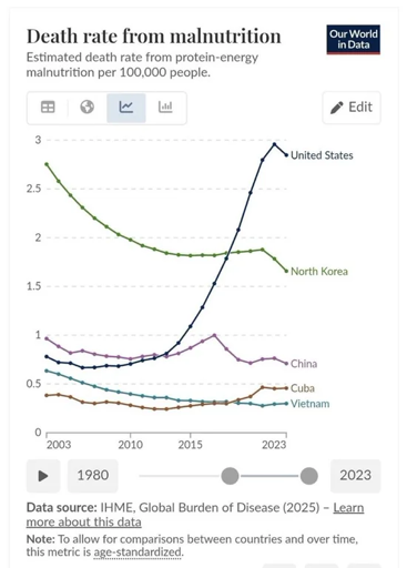 The main reasons for the rise in death to malnutrition are eating disorders such as anorexia. This reflects a wholly different contradiction which we should focus on instead of misrepresenting material reality.