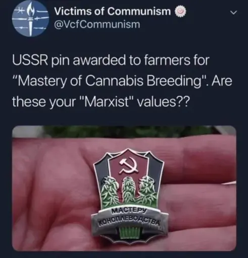 Also, which is it libs? Did the USSR have a war on drugs a million times worse than the US where even touching a weed leaf got you the death penalty or was cannabis so normalized the government literally gave awards to producers? I’ve mostly heard the former in countries like Canada along the lines of “we never would have legalised weed if we were socialist! You’d be dead or in a gulag right now, stoner commie!”