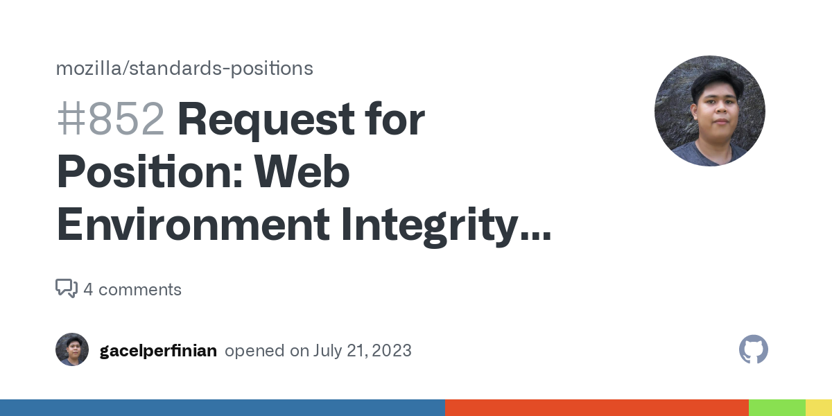 I see that, after people raised a whole bunch of issues with the proposal, there’s a new message on the Web Integrity API repository: “An owner of this repository has limited the ability to open an issue to users that have contributed to this repository in the past.” So the Google engineers’ response to people pointing out the defects of the proposal was to shut down people’s ability to raise issues with it. It’s a good little preview of how they intend to treat the web’s users.