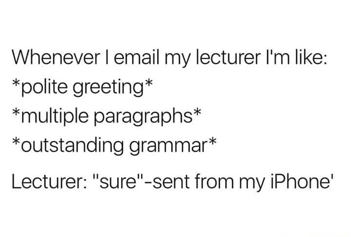 Honestly as a person that was in the teaching position for college students. Don’t email me anything too long just get to the point and generally I don’t care lol