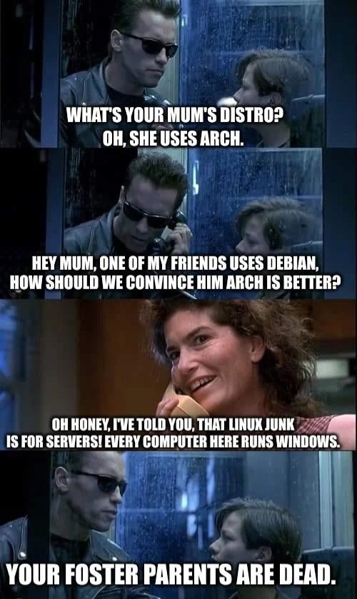 alexei_1917 [mirror/your pronouns]@hexbear.netOPto GNU+Linux Humor@lemmy.ml•Terminal junkies be like...English1·16 days agoTbh, I don’t hate CLI utilities or MC type “terminal interface” stuff. Honestly, if they are well documented and user friendly, I sometimes actually prefer them over a complex GUI cluttered with 20 options that aren’t the one thing I need. This isn’t about people using/recommending well documented, simple CLI tools that make complete computer idiots like me feel powerful and really don’t need a graphical frontend anyway. This is about people who insist on doing everything in a terminal window or in the TTY (and not even having a window manager installed), just for the sake of it, even when it comes to tasks where using the terminal really makes no sense.