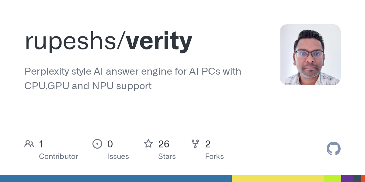 Technology@lemmy.ml•Verity,a Perplexity style AI search and answer engine that runs fully locally with CPU/GPU/NPU acceleration